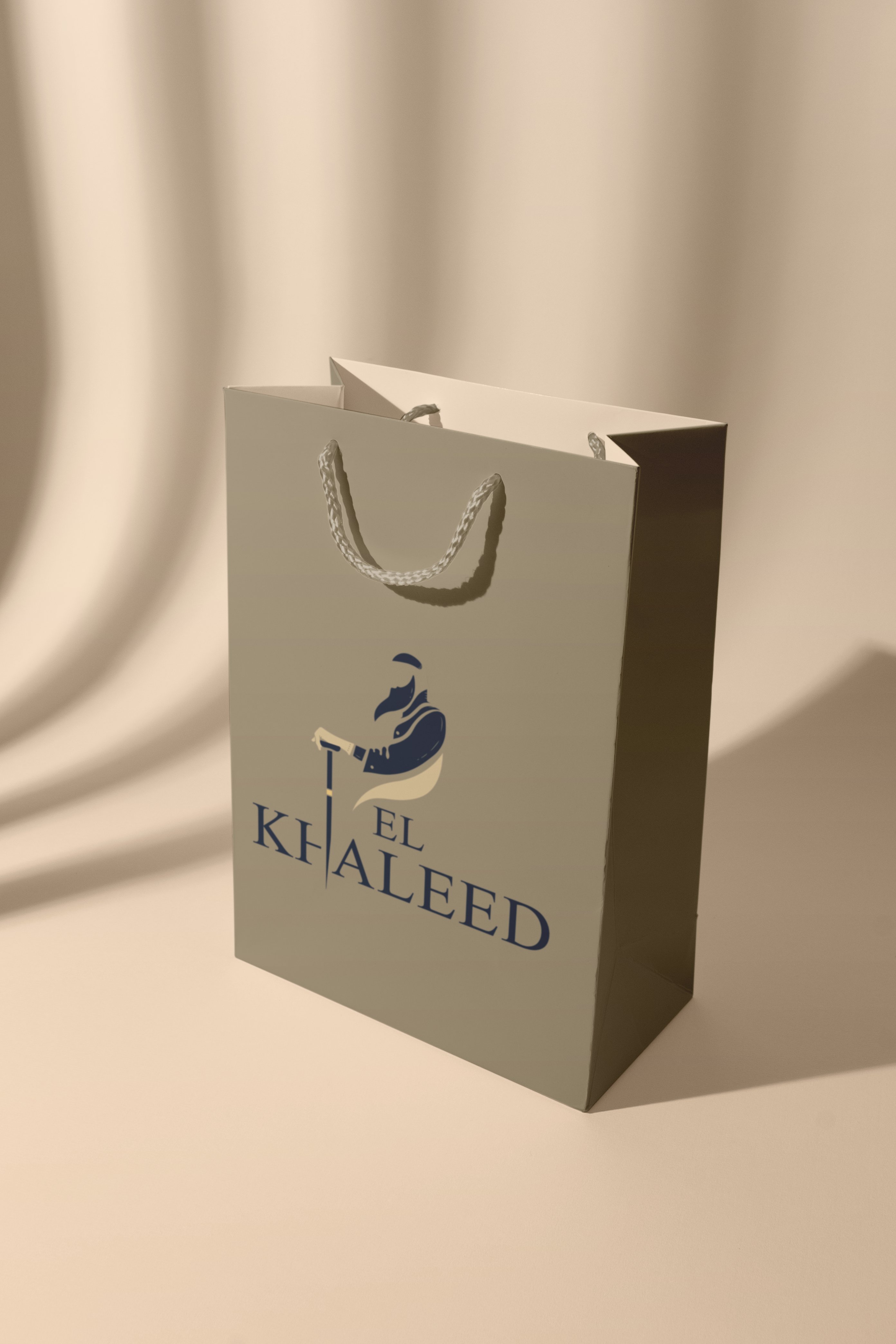 Le logotype El Khaleed associe alors une image à ce nom en représentant un homme barbu tenant une canne; afin de supposer de manière implicite, l’idée d’un grand-père sans volonté non plus de véhiculer cette idée de manière claire.
